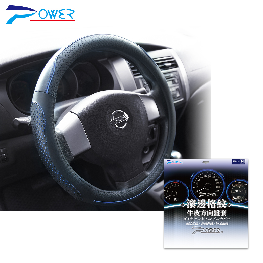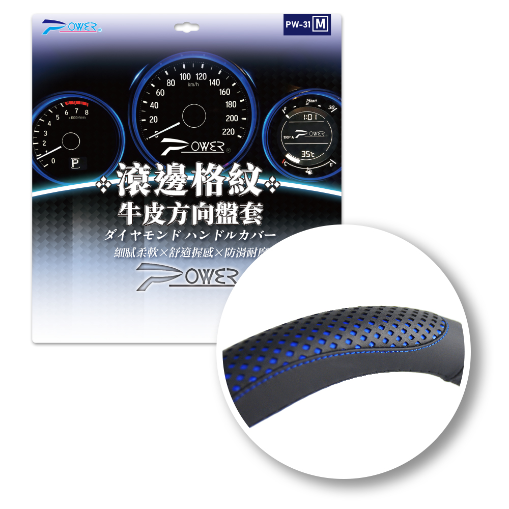 【POWER】PW-31 滾邊格紋牛皮方向盤套-藍(S.M.L)